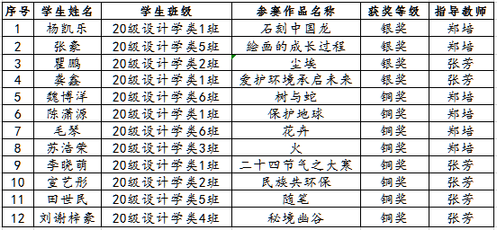 近日,“第五届国际环保公益设计大赛”中国赛区组委会公布获奖名单,公司2020级设计学类12名同学创作的“传统美术创作”作品荣获银奖4项、铜奖8项。4项银奖作品将获得参加全球总决赛资格。