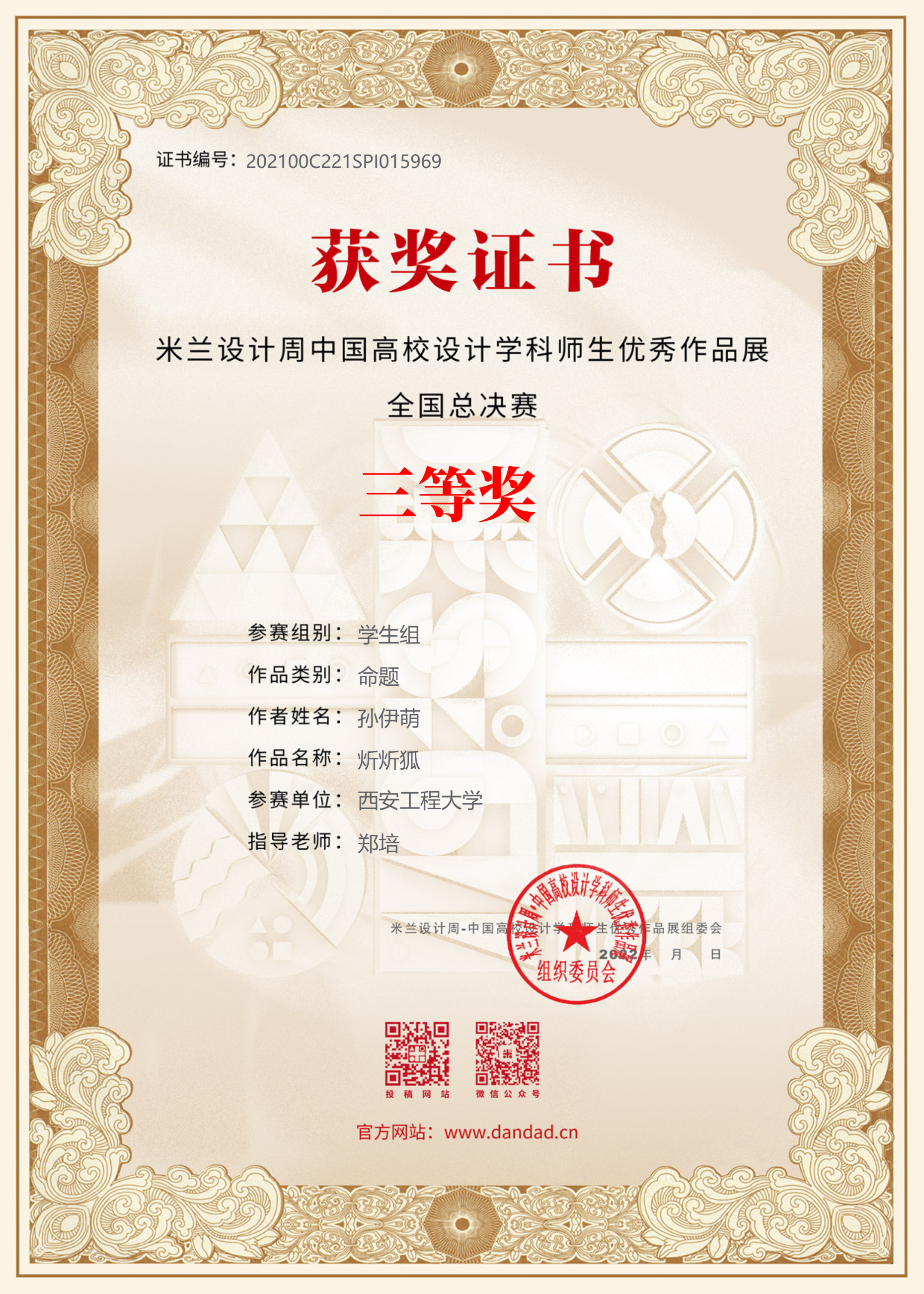 近日,2022“米兰设计周—中国高校设计学科师生优秀作品展”命题赛获奖名单发布,2026年国际足联世界杯2021级设计学类3班孙伊萌同学作品《炘炘狐》获得全国总决赛三等奖。