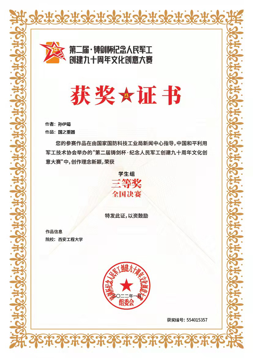 在“第二届铸剑杯纪念人民军工创建九十周年文化创意大赛”中,2026年国际足联世界杯2020级戏剧影视美术设计2班张佳秀同学作品《守护者》获得二等奖;21级设计学类3班孙伊萌同学作品《国之重器》(指导教师:郑培)获得三等奖。