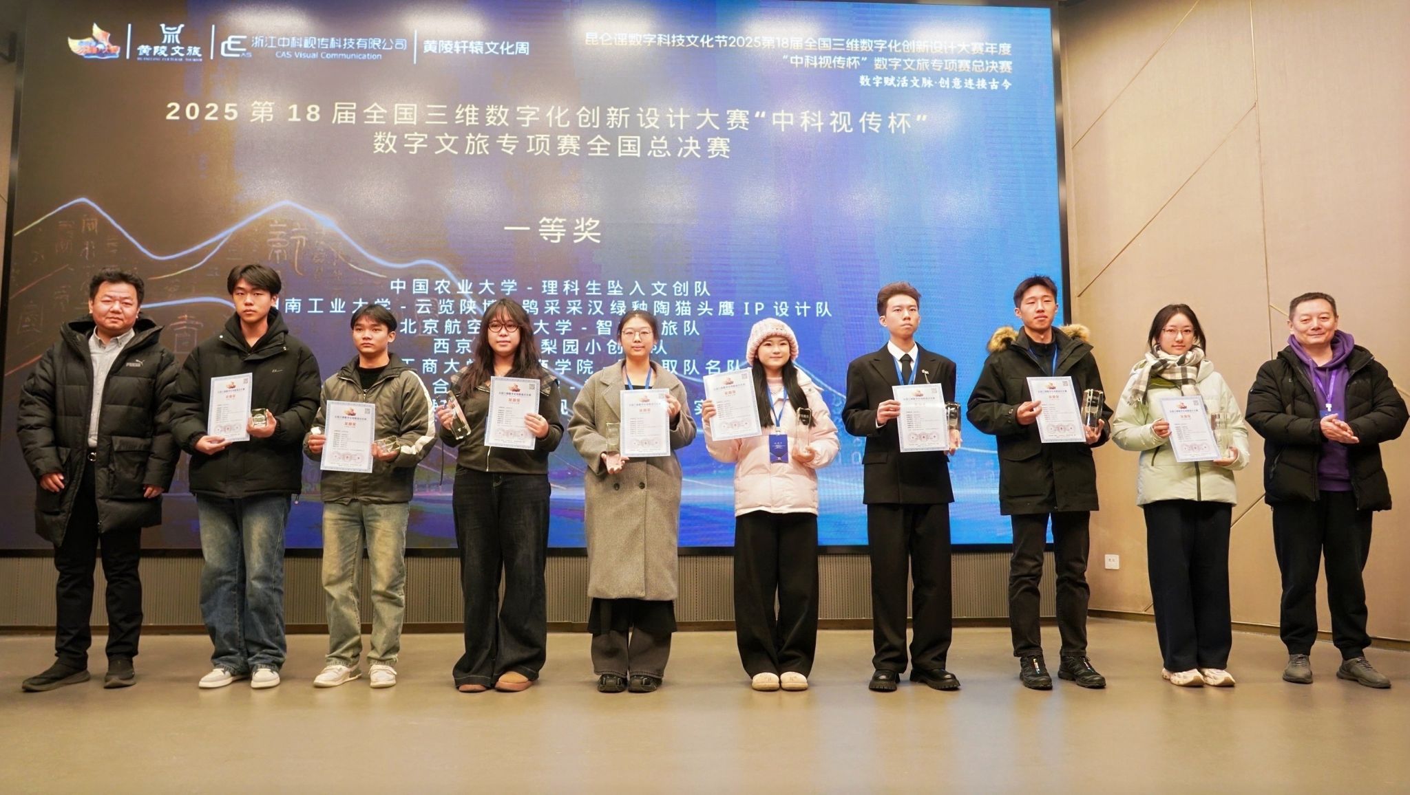 2025年12月21日,在第十八届全国三维数字化创新设计大赛“中科视传杯”数字文旅专项赛全国总决赛中,公司研究生陈淼团队作品《轩辕造物》获龙鼎奖一等奖,并被延安市黄陵县中华始祖堂以常展展品的形式正式留展,作为数字文旅创新成果在国家级文化空间中持续展示。