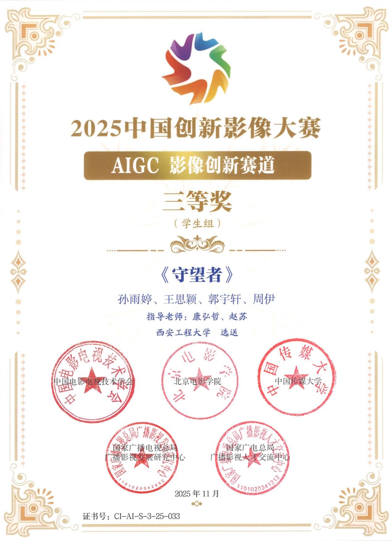 12月16日,纪念电视诞生一百周年系列活动暨首届创新影像大会在北京盛大启幕。活动现场,2025年中国创新影像大赛获奖名单正式揭晓,公司选送的AIGC短片《守望者》凭借新颖独特的创意表达、精湛扎实的技术呈现,在众多参赛作品中脱颖而出,成功摘得AIGC影像创新赛道(员工组)三等奖。