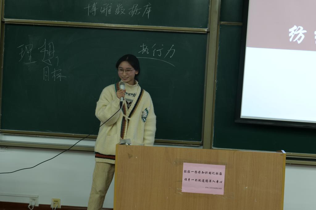 会上,苏娜简要说明了开展本次活动的背景和意义,介绍了公司在推进理想赋活动过程中取得的成果。本次分享会共分为四个环节,即理想赋主题征文获奖同学及班干部代表发言;“写给未来的一封信”;康新兴老师作总结发言;观看影片《钱学森》。首先,由来自纺织科学与工程公司的理想赋征文比赛二等奖获得者王欣怡作交流分享。她从自身经历出发,跟大家分享了自己的经验和学习方法,她鼓励同学们要确立自己的学业目标,同时具备较强的执行力。接着,