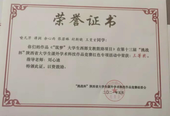 在公司入围的14件作品中,公司作品《“筑梦”老员工西部支教鼓励项目》荣获红色专项赛道三等奖。该项目由2019级编导2班喻凡芹同学负责,刘心迪老师指导,团队成员包括2019级2班的封斯晓、张若琳、余心雨、谭润、王斐玄5位同学。团队从公益性质出发,着眼于当代老员工群体中所形成的“支教热潮”,从而产生了有无偿补贴、严格筛选教团队源、网络平台认证、入出帐记录公开透明等多项创新功能的基金会。