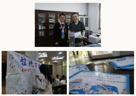 研会的员工干部为老师们精心准备了盲盒和不同种类的鲜花。老师在现场进行抽取,根据抽到的爱心纸条领取相应的鲜花,随后在事先准备好的签名板上签下自己的名字,和同学们合影留念。整个活动过程都弥漫着温情、幸福的气氛,洋溢着同学们对老师深深的敬意以及感激。