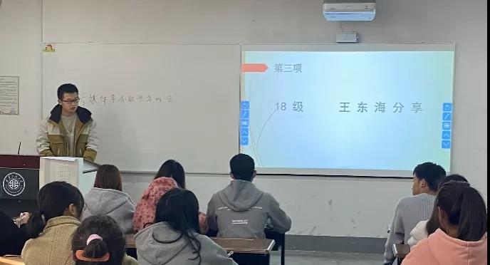 接下来19级助理王东海学长做出了工作分享,王东海结合自身做助理的经验和大家分享了材料整理的规范性和员工助理工作态度的重要性。他希望学弟学妹能继续保持学工办助理的优良作风,做好传帮带,让学办助理团队成为一支高效协作的团队。