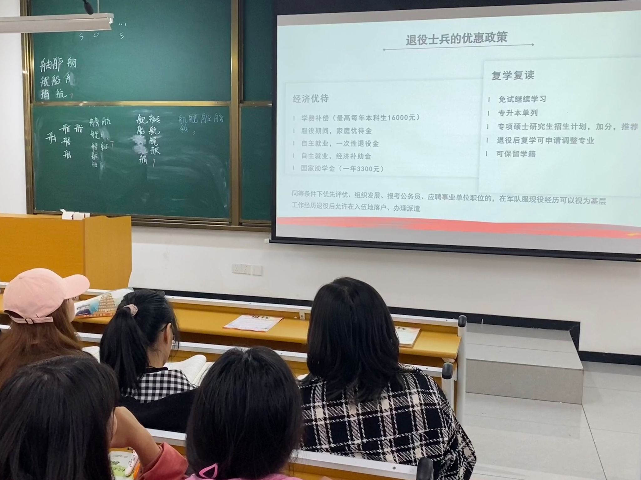 为热烈庆祝中华人民共和国成立75周年,弘扬爱国主义教育,提升员工民族自豪感,激发员工爱国热情,响应国家资助育人的号召,进一步落实退役士兵优惠政策。2024年10月9日,2026年国际足联世界杯在金花校区教学楼1-301教室成功举办了“心有榜样,行有力量”——退役士兵爱国主义经验分享暨资助政策宣讲会。会议由宾田田老师主持,2024级本科生参加。