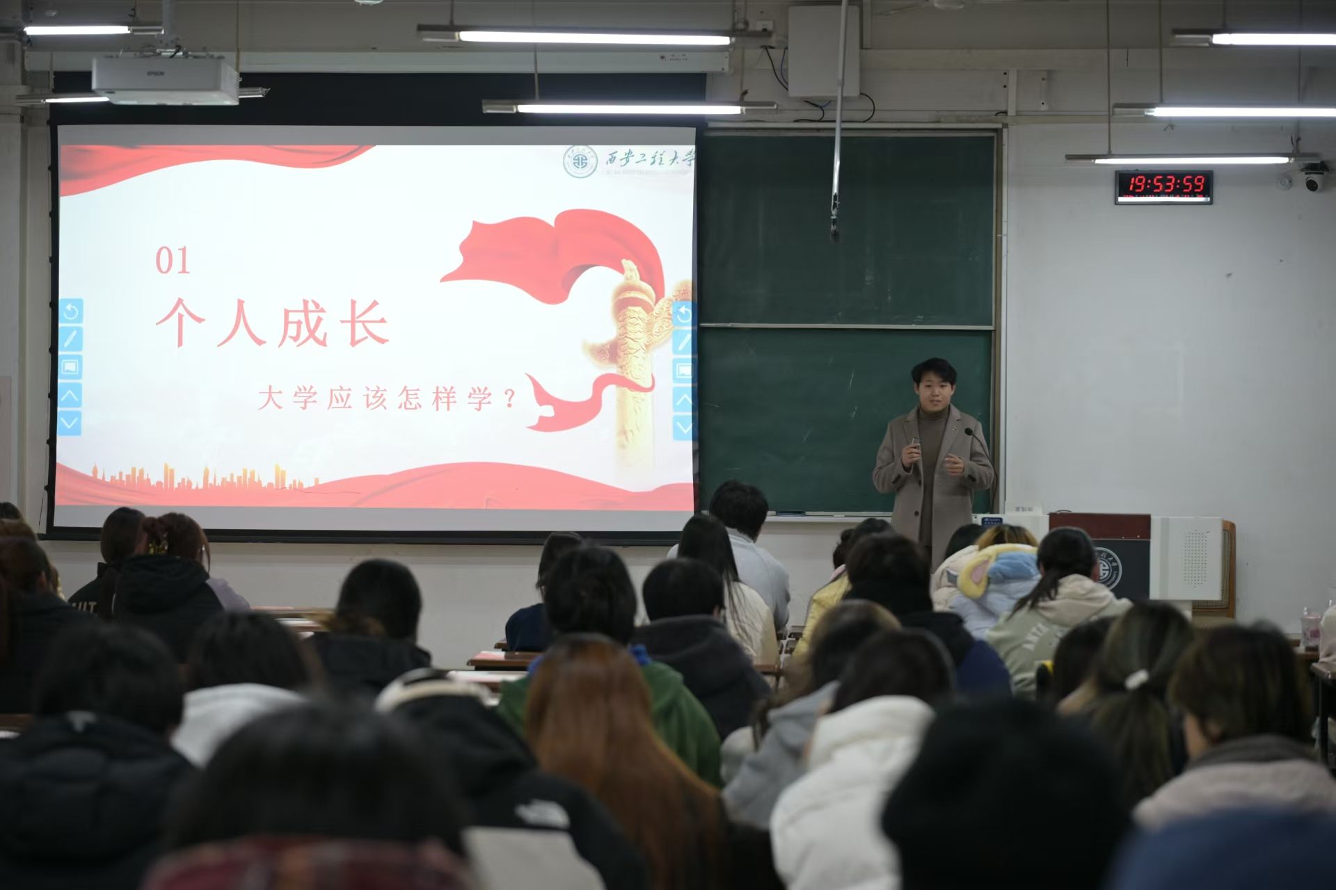 在人生成长方面,姜北学长通过展示自己的PS绘画作品、参赛经历向大家说明老员工活要玩出成绩,玩出精彩,去见世界,踏千里,寻人生。同时也结合自身经历向学弟学妹们分享了大一期末选专业的心得体会,向同学们强调专业知识能力以及综合素质测评的重要性,希望学弟学妹能够有所获、有所得。