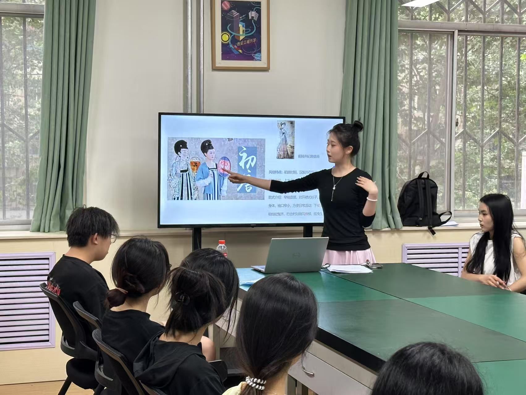 分享会从初唐到晚唐的历史脉络展开,张露丹以生动的讲述勾勒出唐制汉服的演变轨迹:初唐女子着窄袖襦裙,利落飒爽;盛唐兴起诃子裙、大袖衫,尽显雍容自信;晚唐服饰趋向华丽繁缛,层层裙摆如绽放的花影。一段复原唐制服饰的视频让同学们仿佛穿越至长安街头,仕女们织金锦裙曳地、广袖揽月的画面,引得同学们频频惊叹。