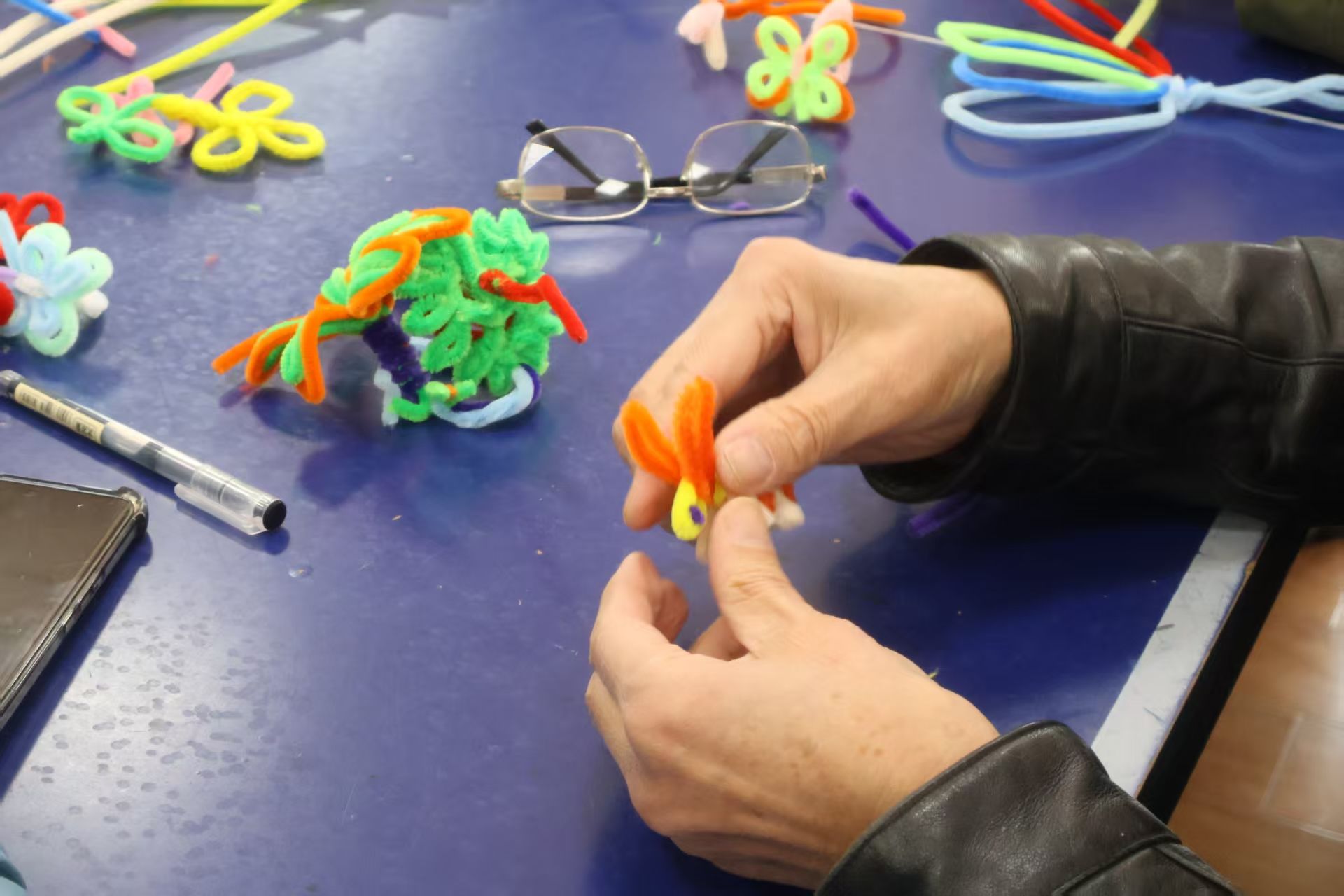 本次共有30位老教师参与,志愿者协助他们完成扭扭棒手工作品,现场氛围轻松而活泼,志愿者们不仅耐心细致地为老教师们讲解步骤、演示技巧,更在交流中认真聆听前辈们的智慧与故事。在年轻的“小老师”和富有经验的老教师共同努力下,一根根普通的扭扭棒被巧妙地弯折、组合,逐渐变成了充满奇思妙想的花朵、小动物等生动造型。现场笑语不断,其乐融融。当基本教学任务完成后,大家更是在此基础上自由发挥创意,享受着手工制作本身的乐趣,温馨的画面成为冬日午后最美的风景。