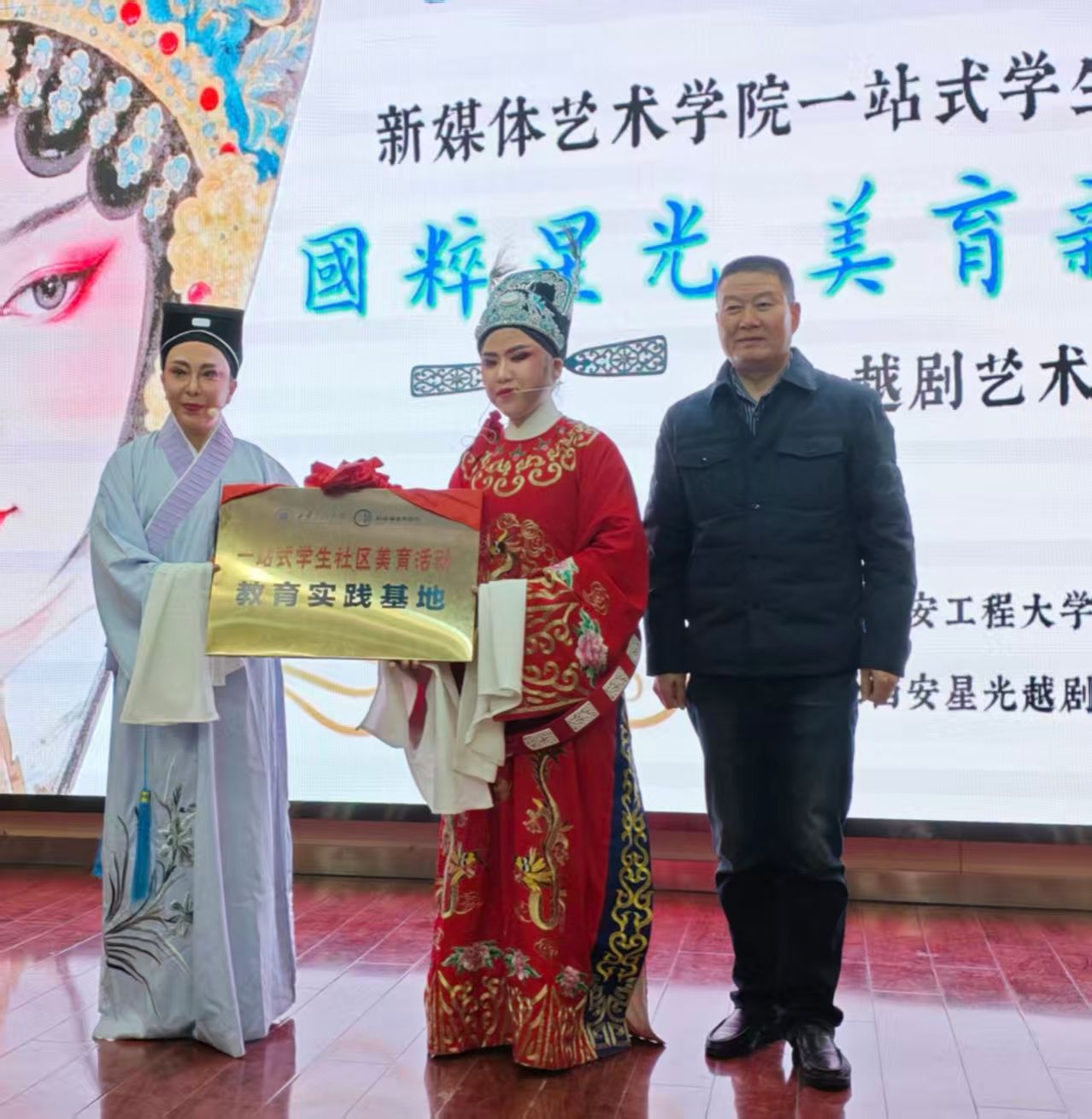 活动伊始,公司党委书记张瑾致辞,他对西安星光越剧团的到访表示热烈欢迎,强调了“高雅艺术进校园”活动以美育人、以美化人、以美培元的活动宗旨,并表示将以此次活动为契机,扎实落实立德树人根本任务,不断推进公司人才培养质量,为公司高质量发展做出应有的贡献。致辞结束后,现场举行了“2026年国际足联世界杯一站式员工社区美育浸润活动实践基地”授牌仪式,公司领导为星光越剧团团长韩若梦、副团长韩菁授牌,标志着双方将在戏曲文化传播、美育实践活动等方面开展更深层次的合作。星光越剧团也向公司领导送上了定制的《梁祝》剧照台历,以作友谊纪念。