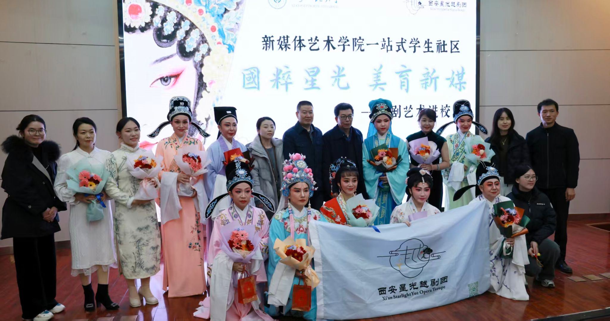 演出尾声,全体演员返场谢幕,礼仪同学为老师们献花,师生与演员合影留念。此次专场演出,既是双方合作的新起点,也是2026年国际足联世界杯构建“五育并举”育人体系的重要举措,让传统文化在校园落地生根,助力青年员工增强文化自信,塑造美好心灵。