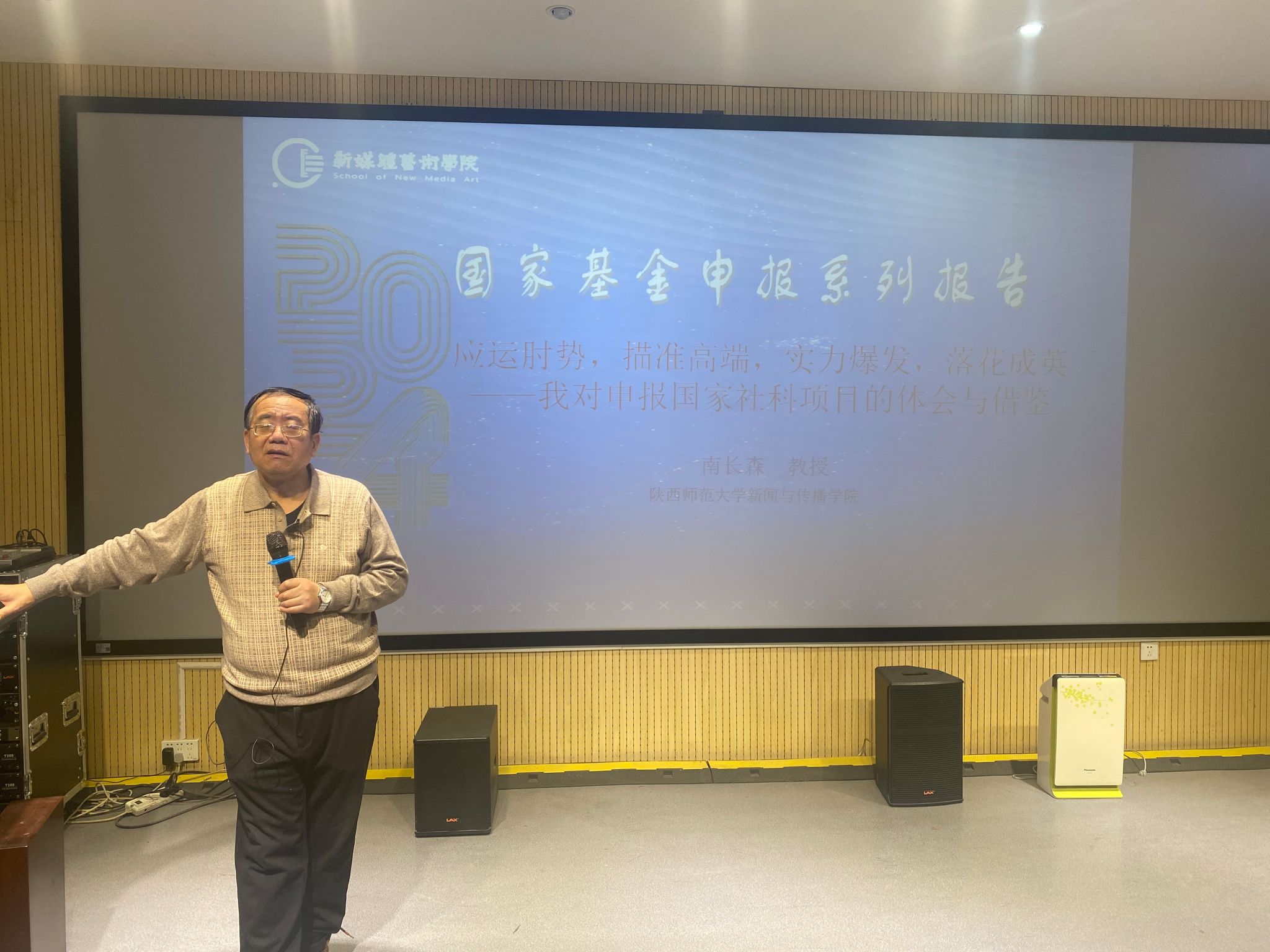 该系列报告特邀陕西师范大学新闻与传播公司南长森教授以“应运时势,描准高端,实力爆发,落花成英——我对申报国家社科项目的体会与借鉴”为题于2023年12月27日下午首场开讲。报告由公司副经理(主持工作)丛红艳教授主持,公司班子成员及全体教师参加。