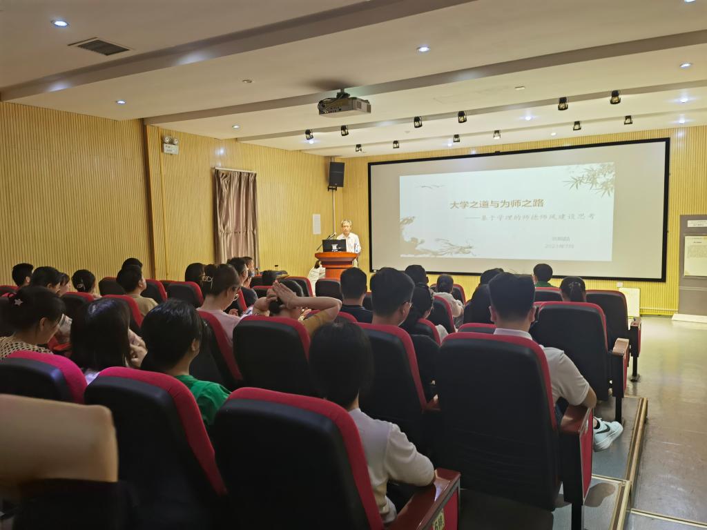 第二部分:刘晓喆教授以《大学之道与为师之路——基于学理的师德师风建设思考》为主题,通过引用大学之道的“三纲领”和“八条目”,借鉴古代先贤的智慧,在道德、学科和至善三个篇章上引经据典,生动地开展了一场引人入胜且发人深思的讲座。他通过详细讲解“道德——遵德明性”、“学科——大学之基”、“至善——树人为善”的内涵和意义,既有理论性的深度,又具有启发性和实践性。他用深入浅出的语言,将抽象的学理与具体的教育实践相结合,使得全体教师能够更好地理解和应用所学。同时,他还引导全体教师对自己的教育理念、教学方法和道德行为进行反思,为教师提供了一种自我成长和进步的思路。这场讲座不仅在理论上拓宽了教师们的思维深度,也在实践层面上指明了教师们的方向;不仅给予了全院教师新的思考和启示,还为师德师风建设提供了宝贵的经验和指导。
