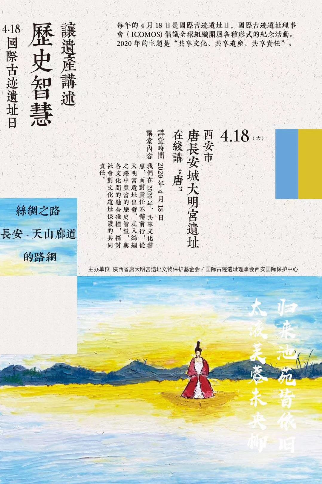在4·18国际古迹遗址日之际,为响应“共享文化、共享遗产、共享责任”的主题号召,近日丝路文化遗产公益网课活动在大明宫国家遗址考古公园拉开帷幕。此项活动由陕西省唐大明宫遗址文物保护基金会、国际古迹遗址理事会西安国际中心(IICC-X)联合推出。