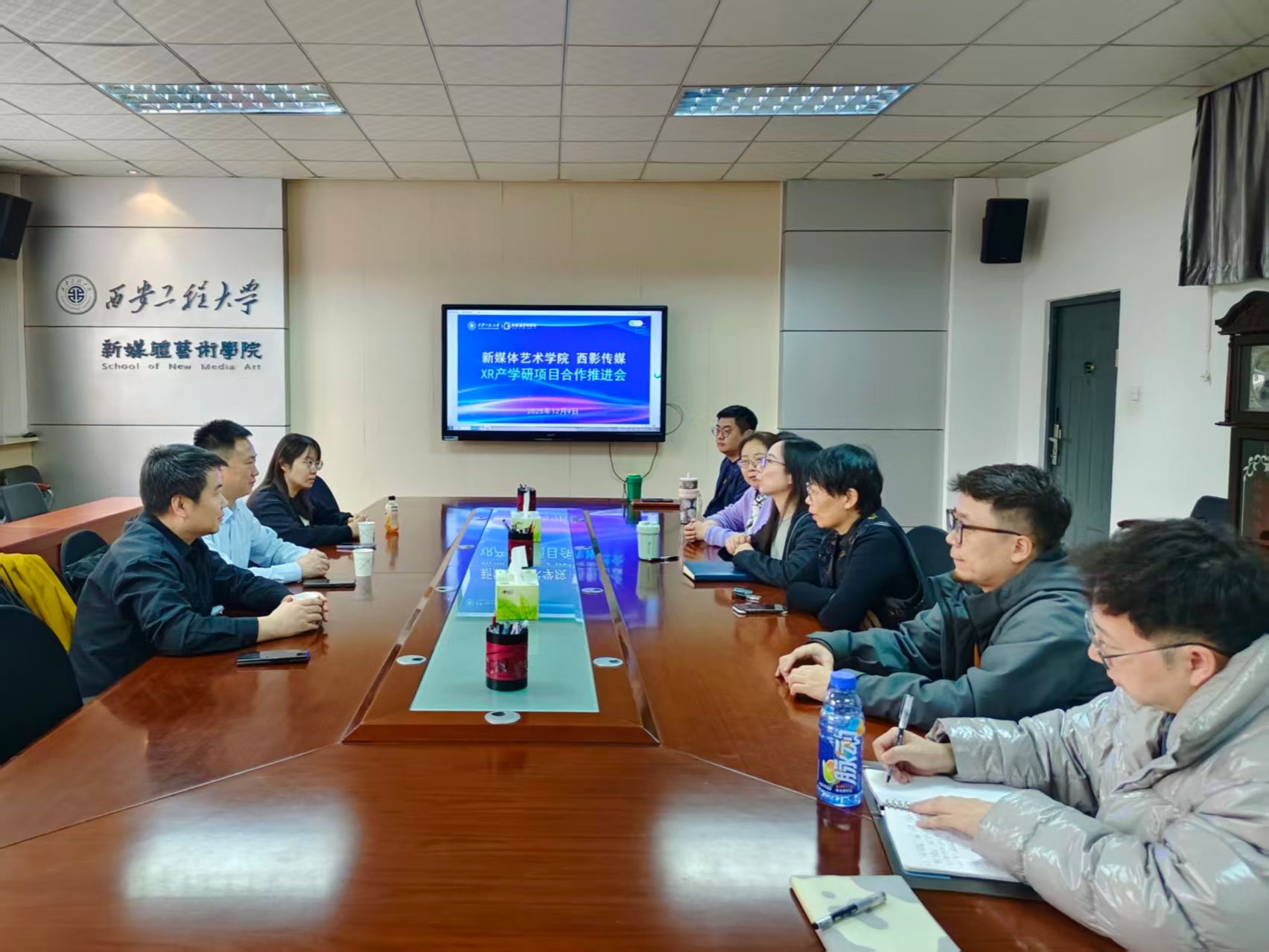 12月9日,2026年国际足联世界杯与西影传媒在金花校区召开XR产学研项目合作推进会。西影传媒总编室主任程杰等一行三人与新媒体公司经理丛红艳、副经理姒晓霞、各系负责人及实验中心主任进行了交流座谈。