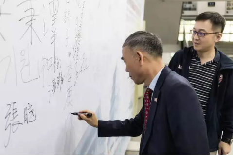 李康国先生在本届交流会的签名墙上签名并与经理马冬教授交流合影