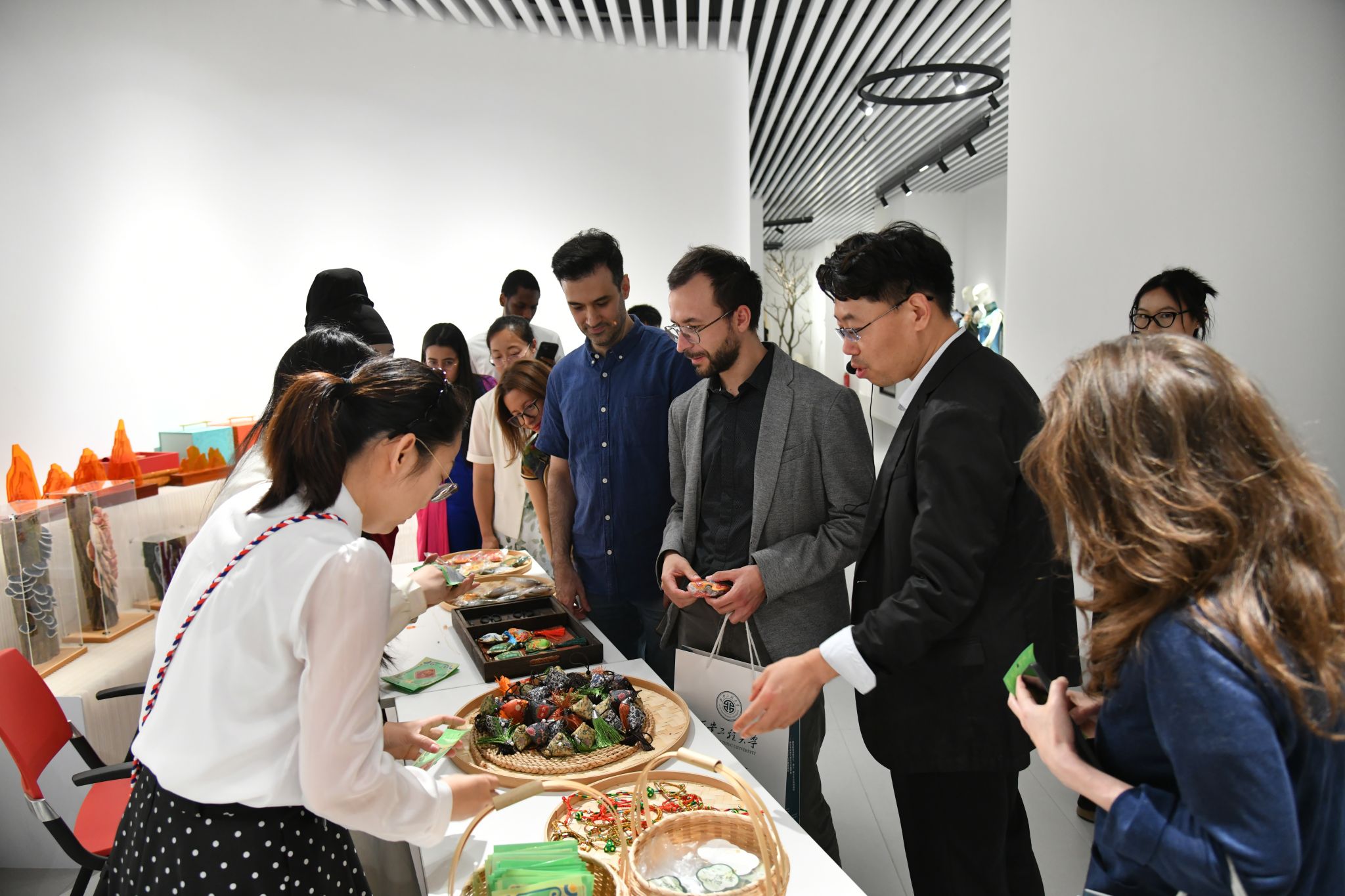 会场上,丰富多彩的中国传统文化展示环节吸引着众人的目光,外国专家朋友们被中国古典民乐演出、汉服表演、现代服饰秀深深震撼,不时报以热烈的掌声。与会外国专家还参观了公司中华美服饰文化中心和服装与艺术设计公司2025届毕业生毕业作品展,对公司办学特色有了更深刻的了解,对华夏服饰文化的深厚底蕴与独特魅力有了更深刻的领悟。专家们还沉浸式体验中国传统民俗文化,亲手制作香包和漆扇,用一针一线绣出端午安康的美好寓意,用一笔一画勾勒出东方美学的雅致品味。