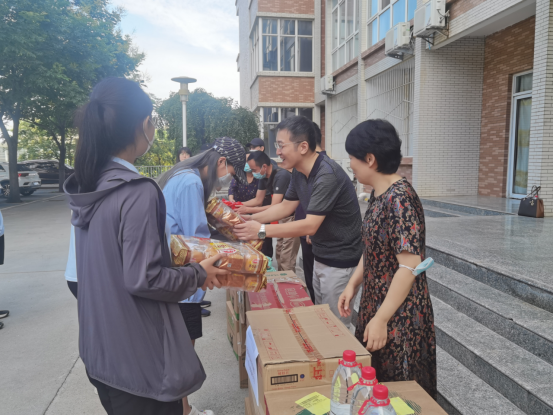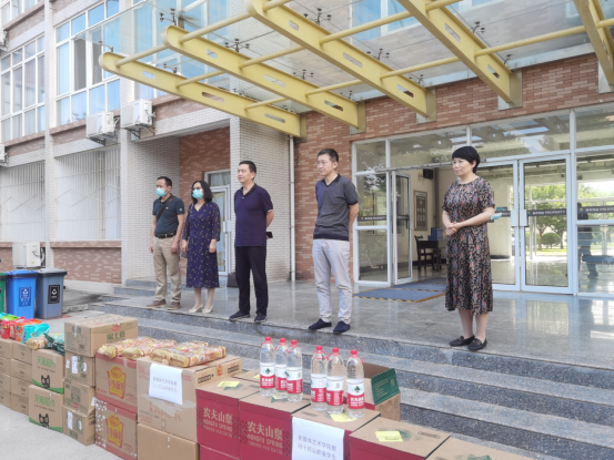 慰问会的第二项,公司领导给群演员工分发慰问品。公司前期充分了解员工训练期间的生活、饮食需求,为同学们购买了一批生活上必不可少的食品。