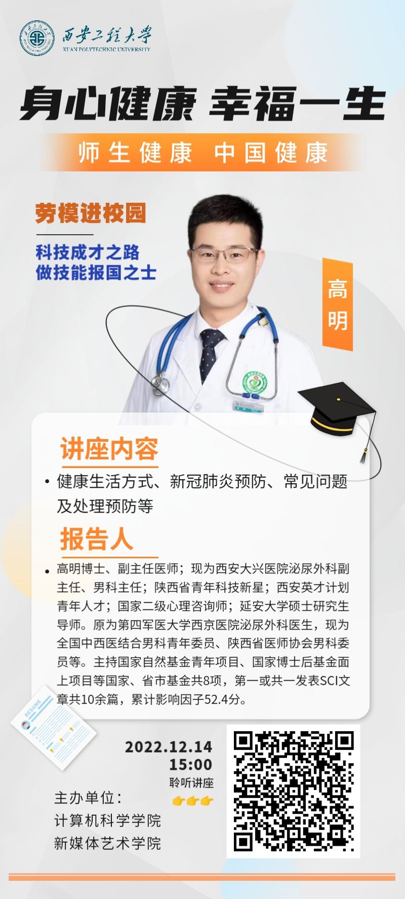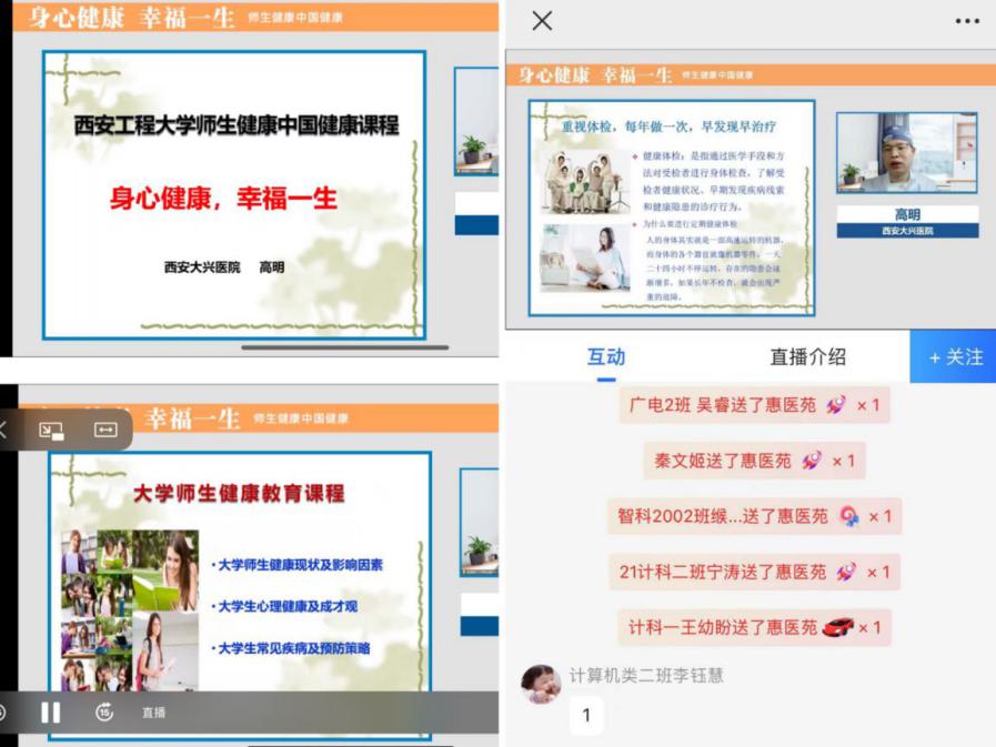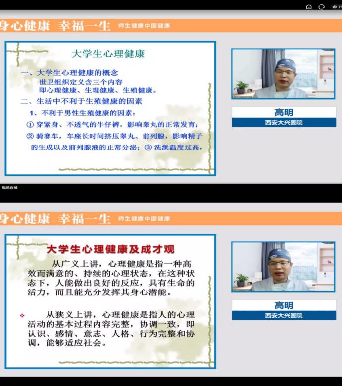 本次讲座以线上形式进行,讲座包括健康的生活方式、新冠肺炎预防、人体常见疾病的处理和预防等三个方面内容。高明主任讲授了老员工健康现状及影响因素、老员工心理健康常见的问题及如何应对,从医者的角度提醒青年学子要培养良好的生活方式,掌握最基本的安全防护和自我保健知识。对于成长和成才观,高明分享了自己的科技成才之路,建议学子们要正确认识自己,认识自己的生理特点、心理特点,认识自己的优势、劣势,知道“我能做什么,我要做什么”。告诉广大学子生涯规划重在行动,成功源于有效的时间管理,成功关键在于努力学习本领和师长的教育支持;结合当前疫情防控形势,高明对新冠肺炎病毒的来源、传播途径以及在日常生活中如何做好防护等进行了详细的讲解和说明。结合自己的临床专业知识,还为师生讲解了常见泌尿生殖相关疾病的诊治,并对艾滋病的传播、预防和治疗进行了宣讲。高明主任的讲座深入浅出,语言生动诙谐,激发了广大师生和家长的关注和兴趣,大家认真倾听,积极互动,师生就新冠肺炎疫情防护、心理问题、常见病治疗等热点问题积极提问,高明主任一一进行了解答说明,整个讲座过程气氛热烈,秩序井然,师生们在轻松愉快的气氛中接受了健康知识的普及教育。