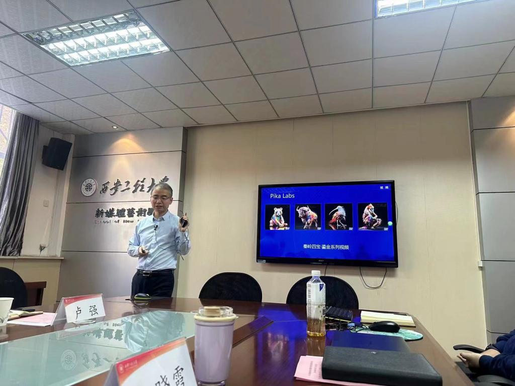 随后,西安邮电大学数字艺术公司经理闫兴亚教授就“AIGC带来的改变”进行主题发言。他结合首届陕西生成式人工智能艺术展对未来艺术教育发展前景和趋势提出了自己的观点,表示在AIGC技术的辅助下开展创作将成为不可逆转的趋势,高校要顺应时代发展,培养“数字+艺术”人才来服务社会。